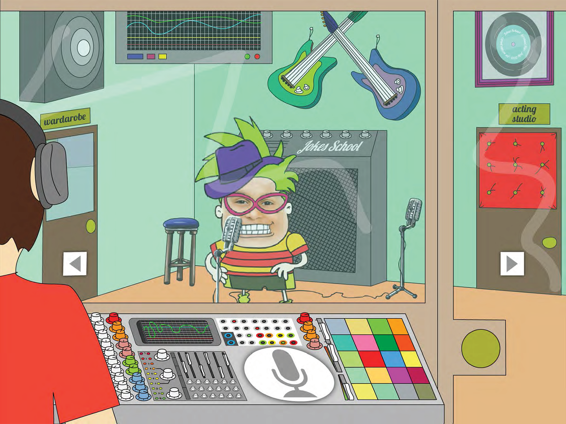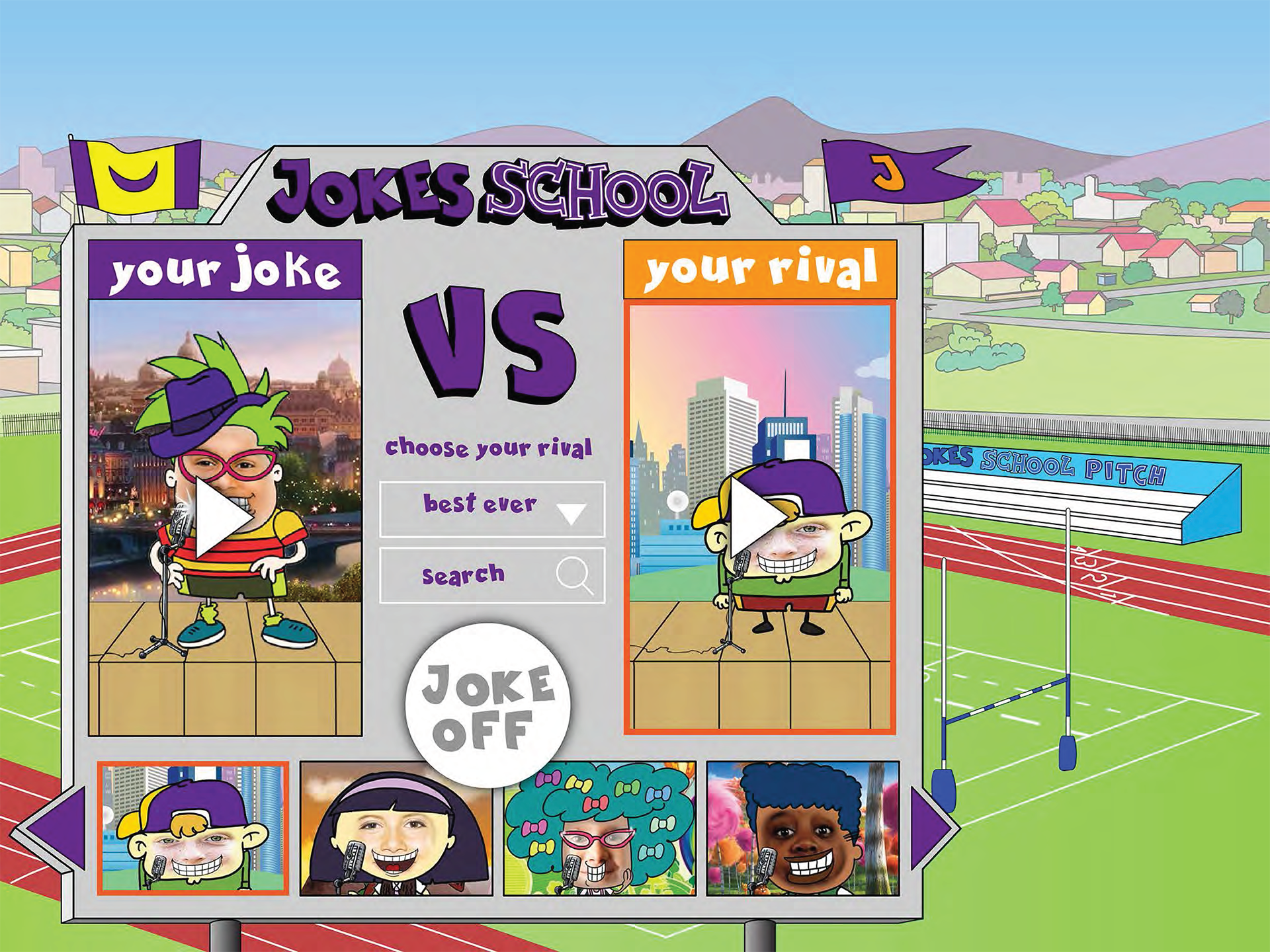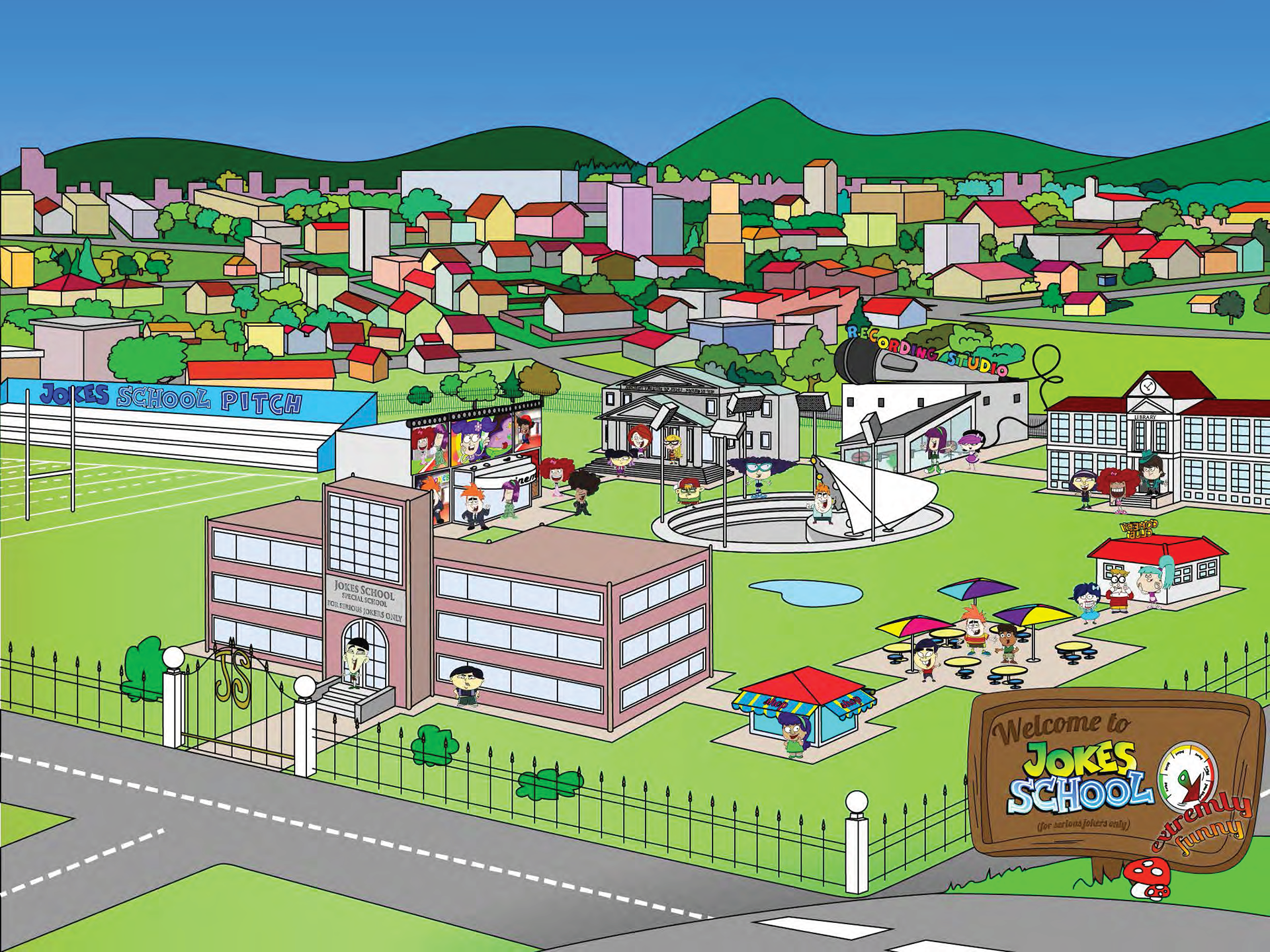 Jokes School Campus. The young user can visit all buildings. Each place has a different function.