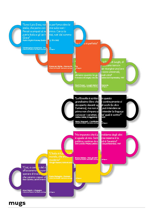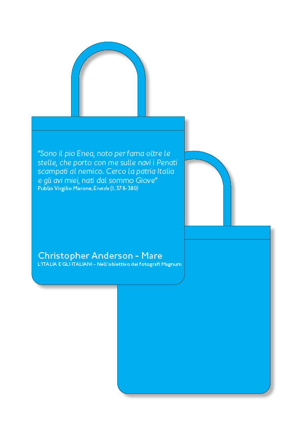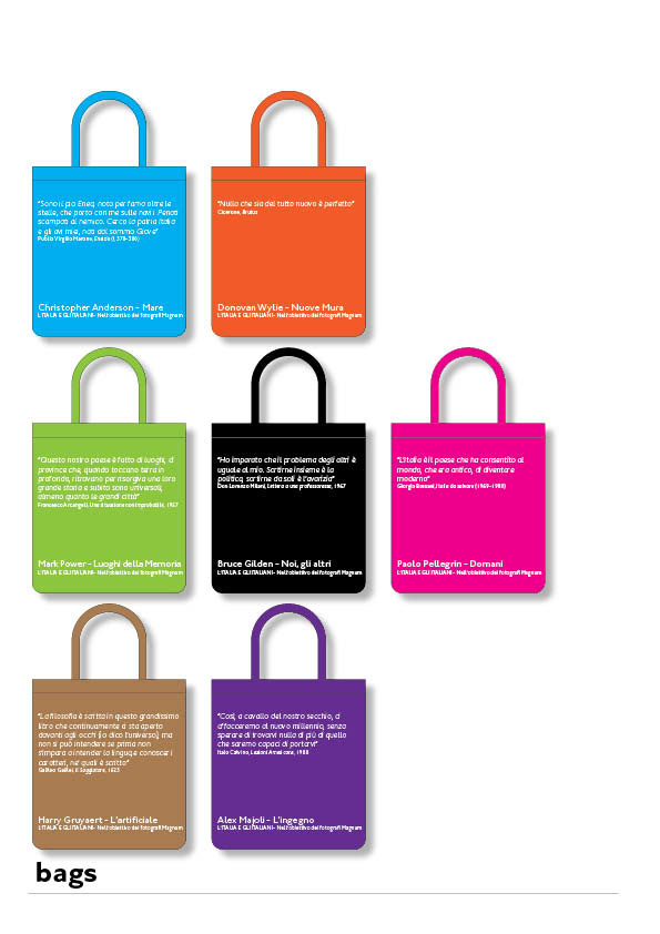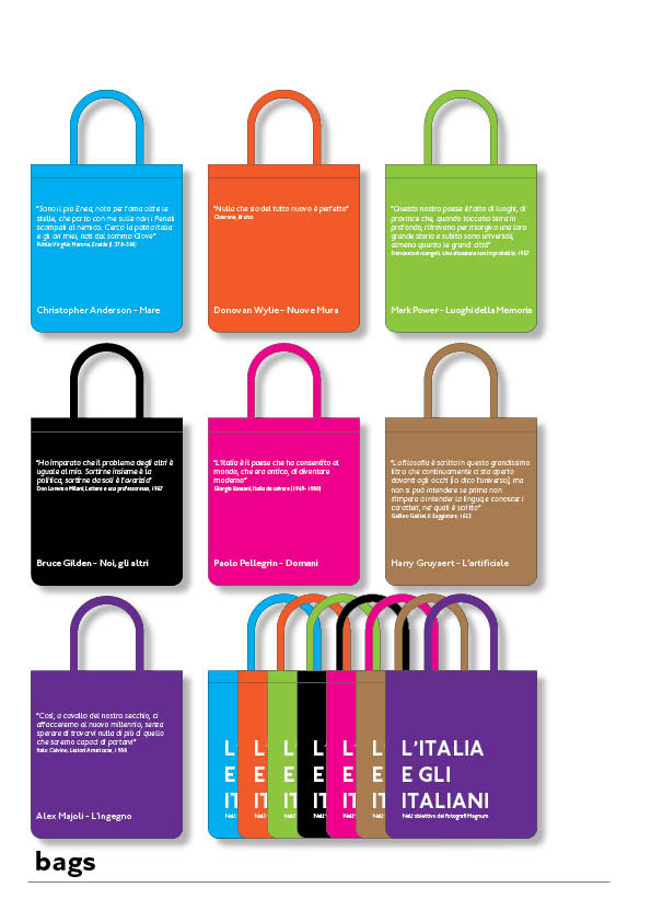 I designed the merchandise for the photography exhibition: "L'Italia e gli Italiani. Through the Lenses of the Magnum Photographers". This work was based on Magnum photos and selected quotes that are used in the catalogue and in the exhibition environmental graphics. http://www.italiaitaliani.com/en