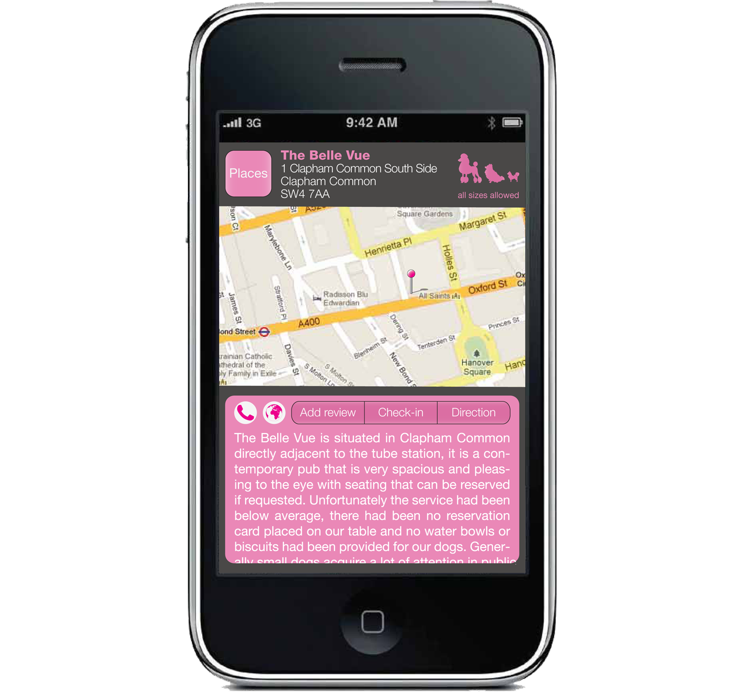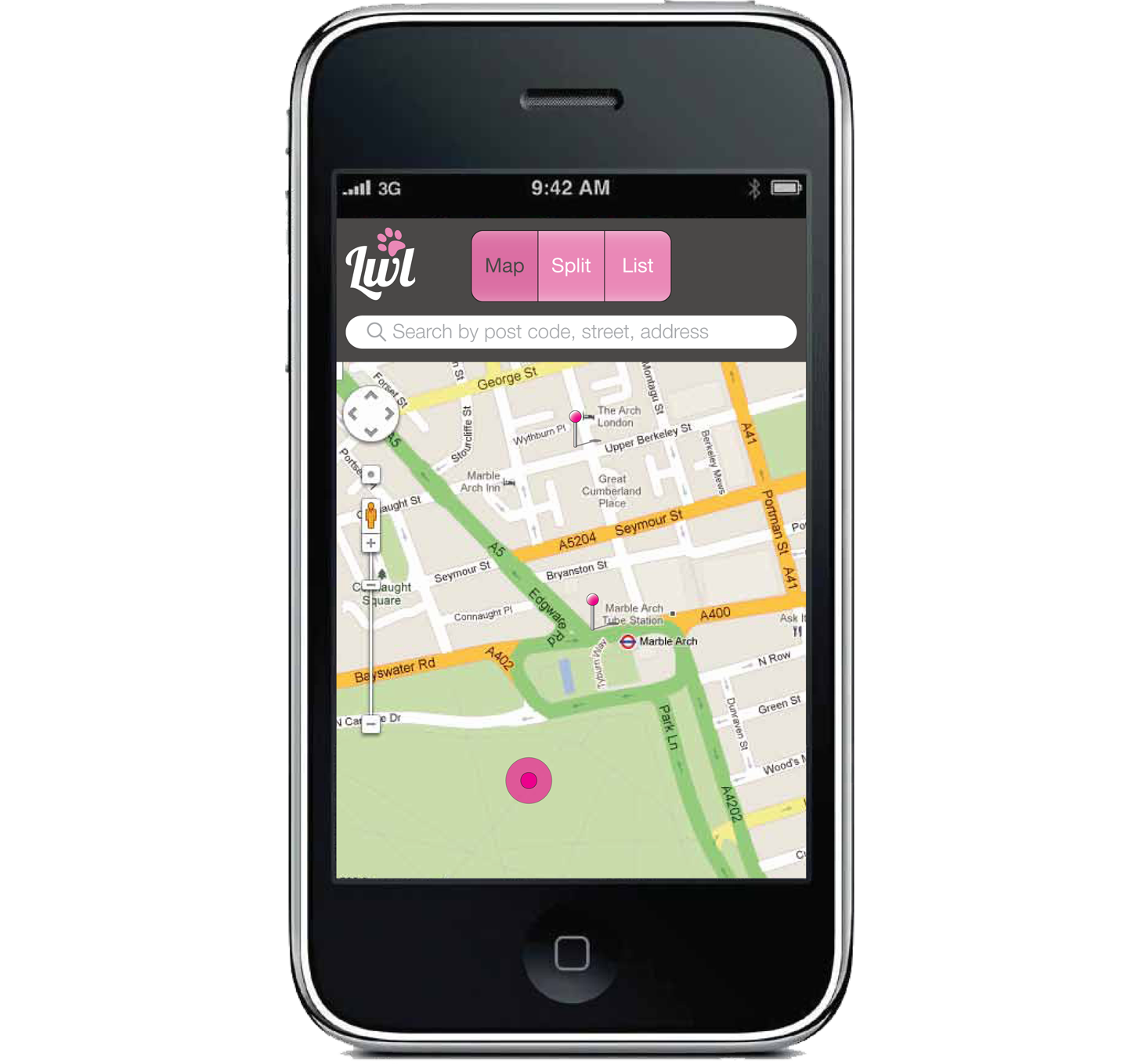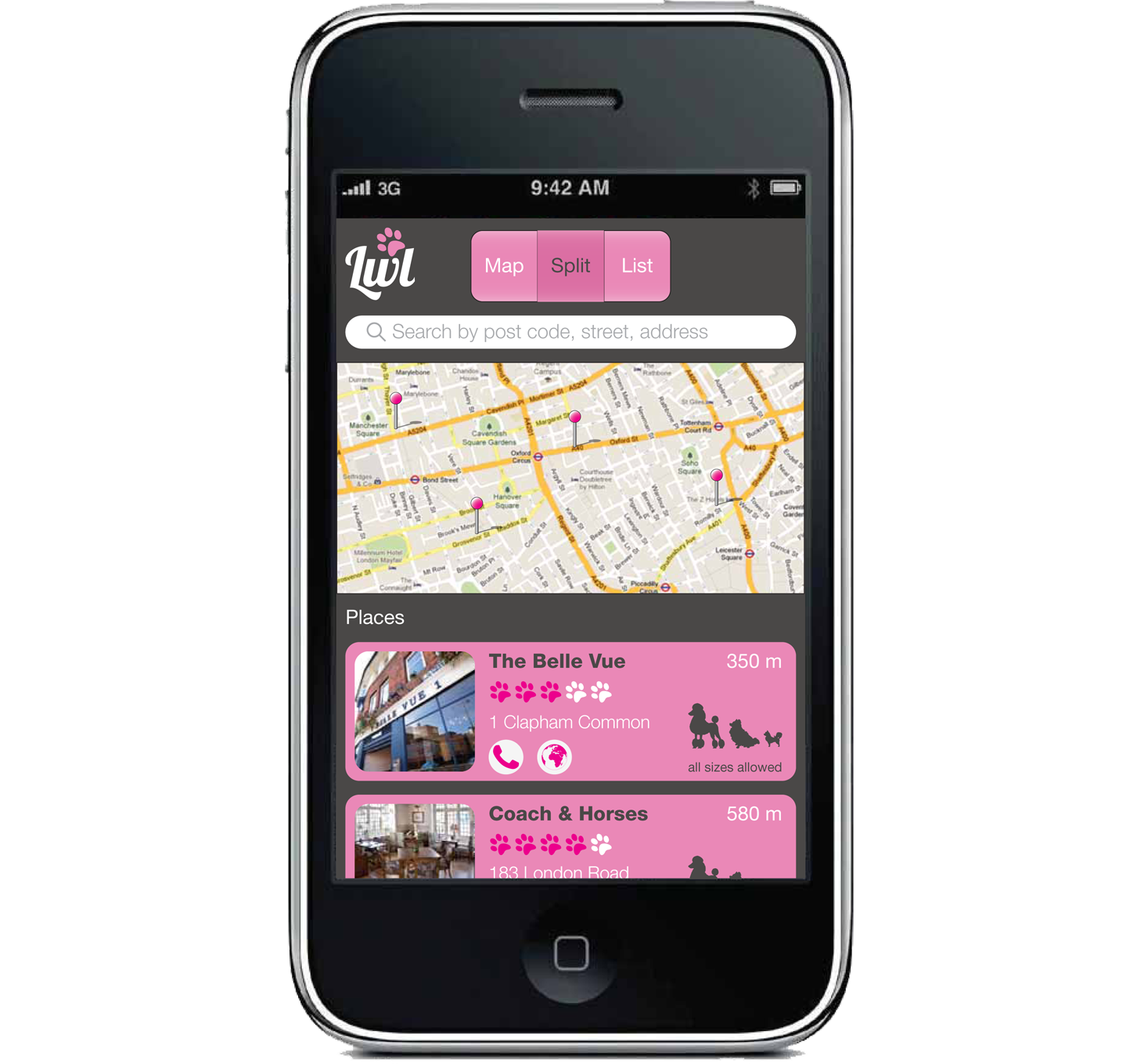 I designed the interface for this new dog-friendly iPhone App. 'London on a lead' is a locations app which lists the 5 nearest dog friendly Pubs. The user has two options they can either use the park drop down menu, which allows you locate the nearest Fido friendly establishment for a post Walkies glass of vino. Alternatively for the spontaneous crowd simply click on the find me icon and the GPS service will find your location as well as your lunch! https://itunes.apple.com/us/app/ladies-with-leads/id666496207?ls=1&mt=8
