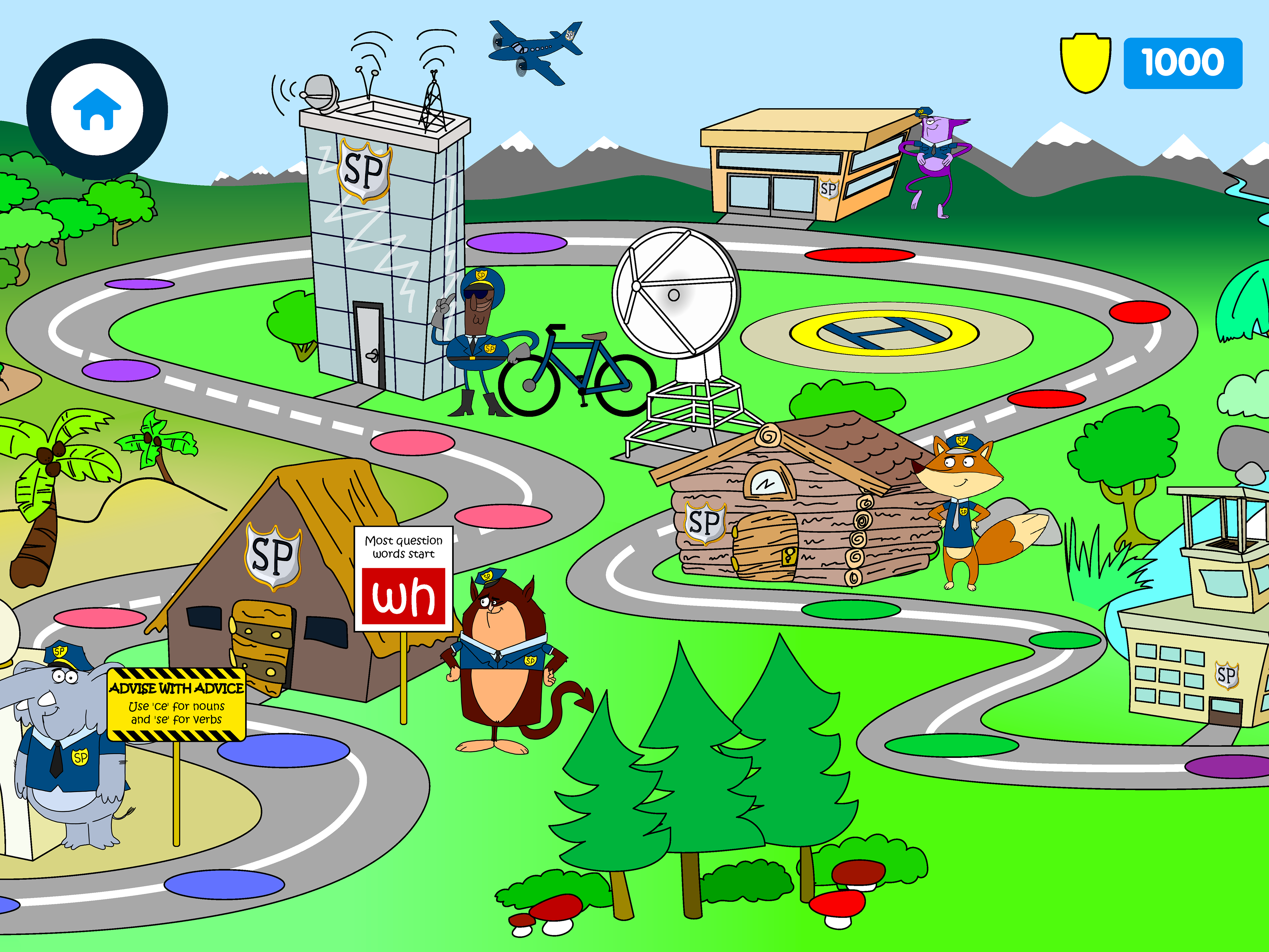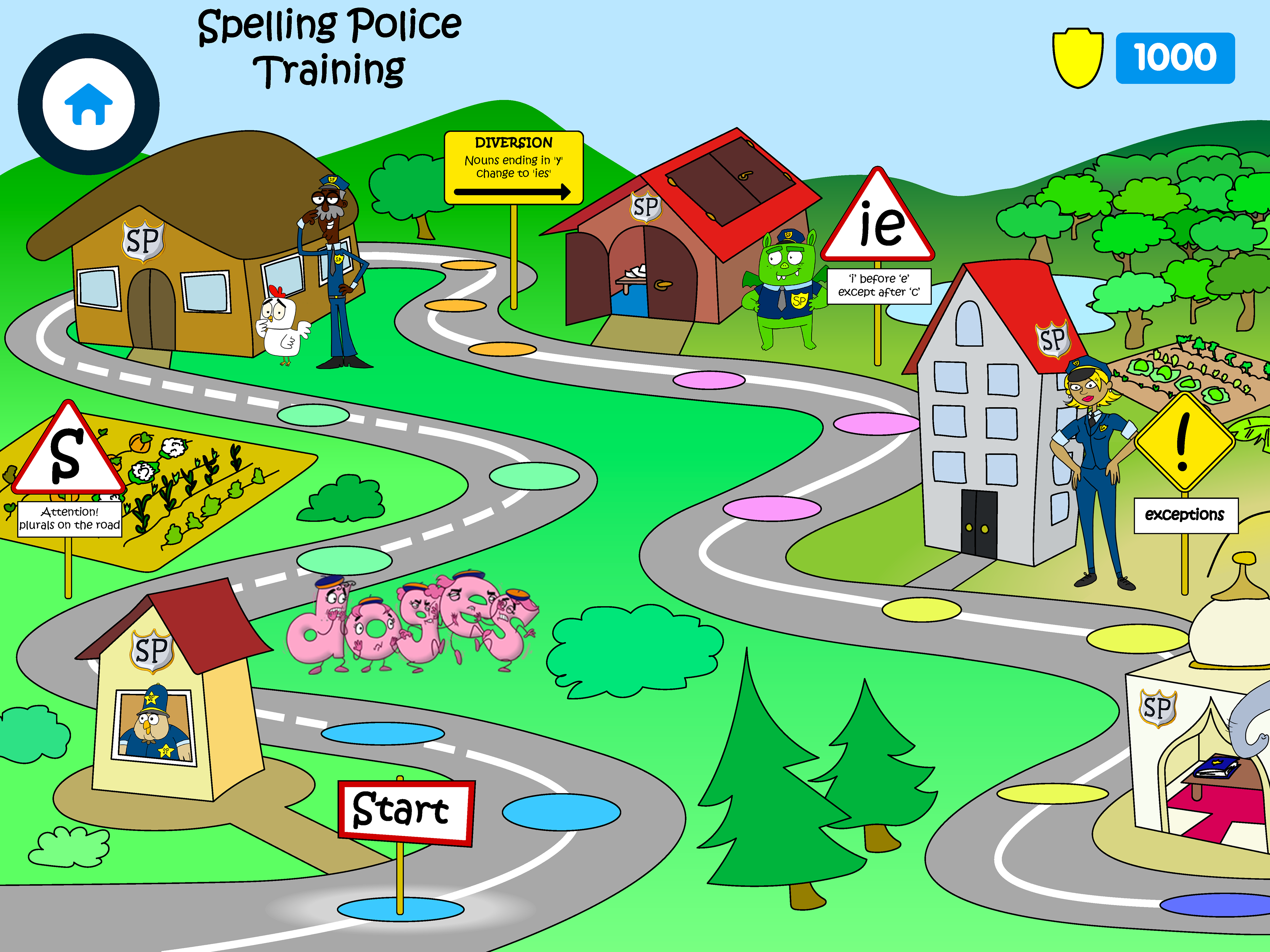 Map screen. The little user will be able to progress watching episodes and practise with the exercises. Each step will bring the user closer to winning the Spelling Police Shield. The map is all my design/illustration, the charachers were developed by an external agency.