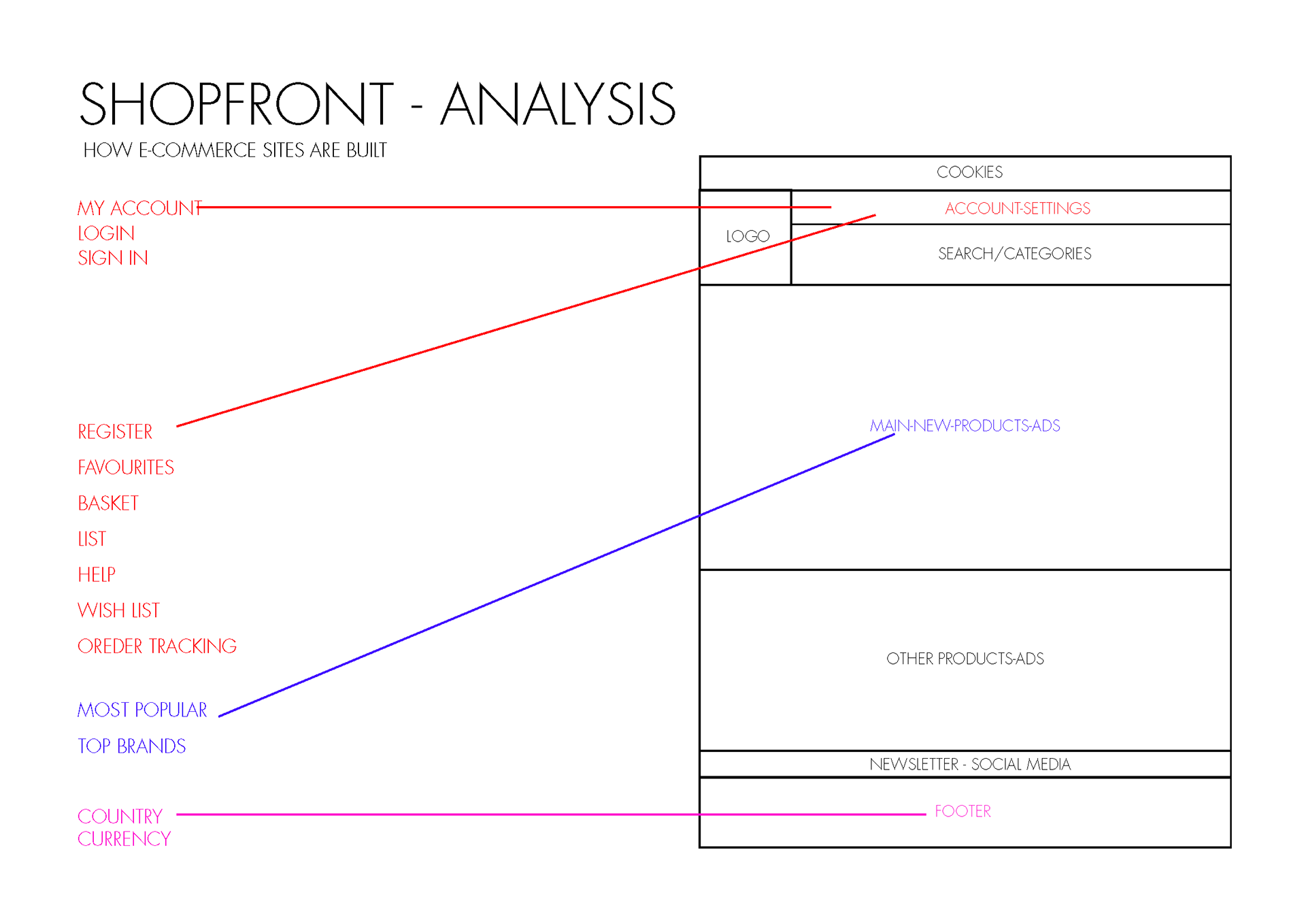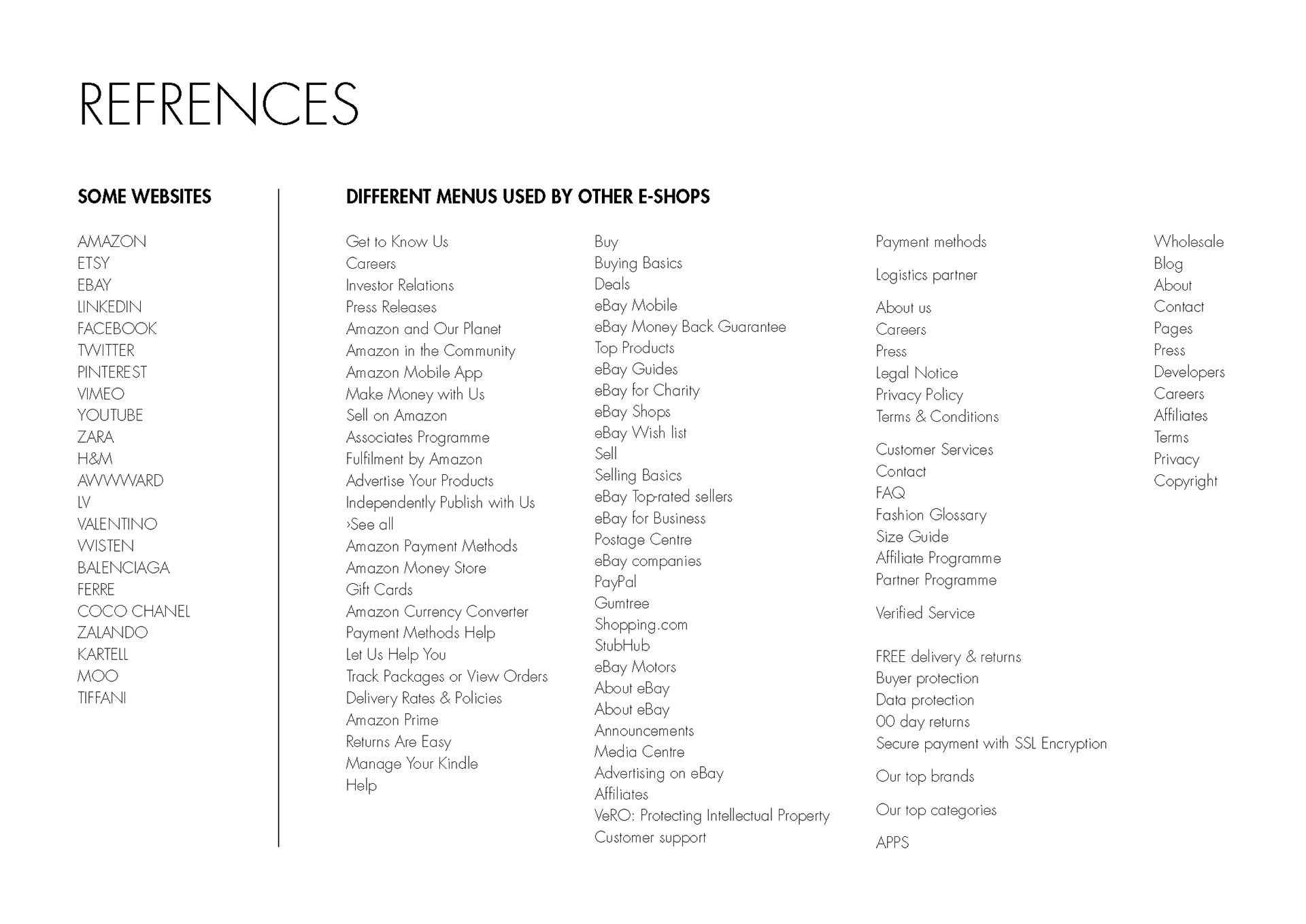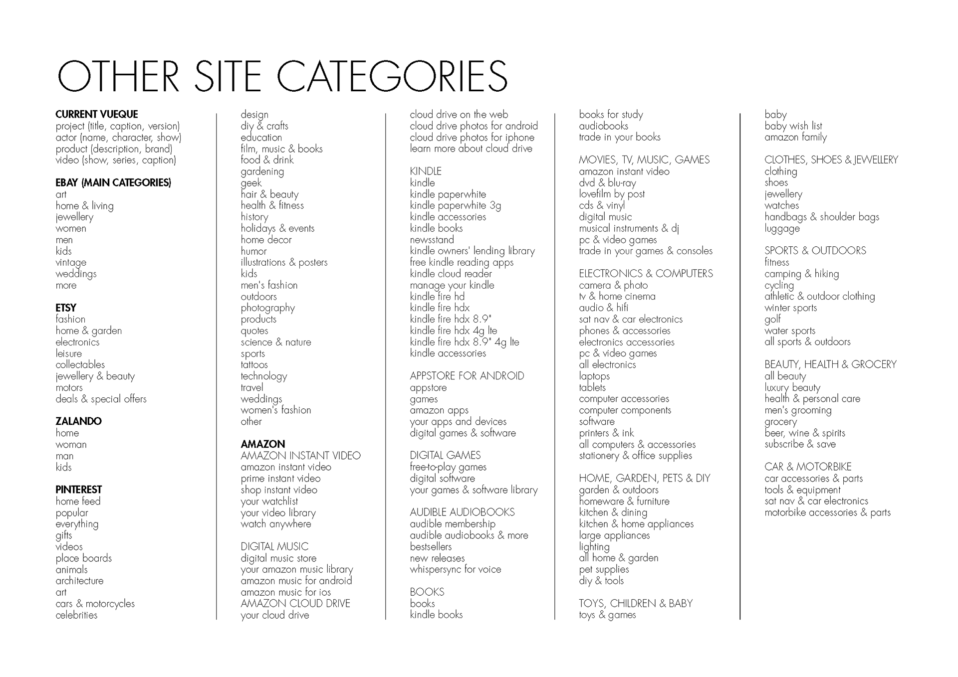 Menu categories used by different web sites.
